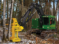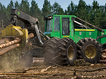 A slideshow with photographs of various forestry machines manufactured by John Deere, like tree cutters and harvesters, in action among the forest trees. Each photo is displayed for about six seconds before the next image fades in.