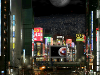 A screensaver depicting a modern city center at night, with animated cars and buses, as well as advertisements on skyscrapers and large screens, and the moon shining down on the suburbs. Traffic and sirens are audible, and a traditional tune plays in the background.