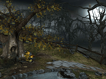Pumpkin Jack, a "man" with a pumpkin for a head, sits quietly on a park bench in front of a large tree, moving his hands and fingers to the sound of the music that plays in the background, in this animated Halloween-themed screensaver for Windows. Every now and then he performs a ritual where he conjures up a burning carved pumpkin, which he then rolls down the hill. An owl sitting in a tree up high views it all from a distance, small dragons breathe fire in the air, and a skeleton walks around in the background.