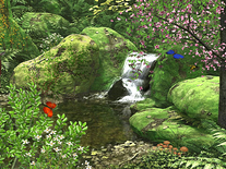 A stream in the middle of a dense, green forest is at the heart of the Spring Stream animated screensaver for Windows. It features a small waterfall that ends in a small stream of water surrounded by large boulders overgrown with moss. Blooming plants and trees frame the picture, butterflies fly through the screen and a deer drinks water from the stream. Sounds of the waterfall and the chirping of birds are included.