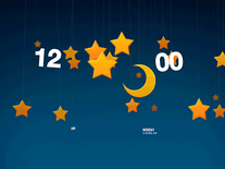 This screensaver shows the current time, day and date using white digits and letters hanging from pieces of string. Similarly, one moon and about a dozen stars hang from strings at various distances, slowly rocking sideways. When the time changes, the digits are pulled up and out of sight, and then the new digits are lowered down. You can choose between a 12 and 24 hour format, and you can optionally hide the clock to show only the moon and stars.