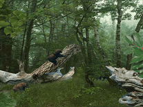 This animated screensaver features three bears walking through a forest. They sit in the grass, walk around, and climb on top of a fallen tree. The screen is framed in the corners by various types of trees and plants. Sound effects or music are not included.